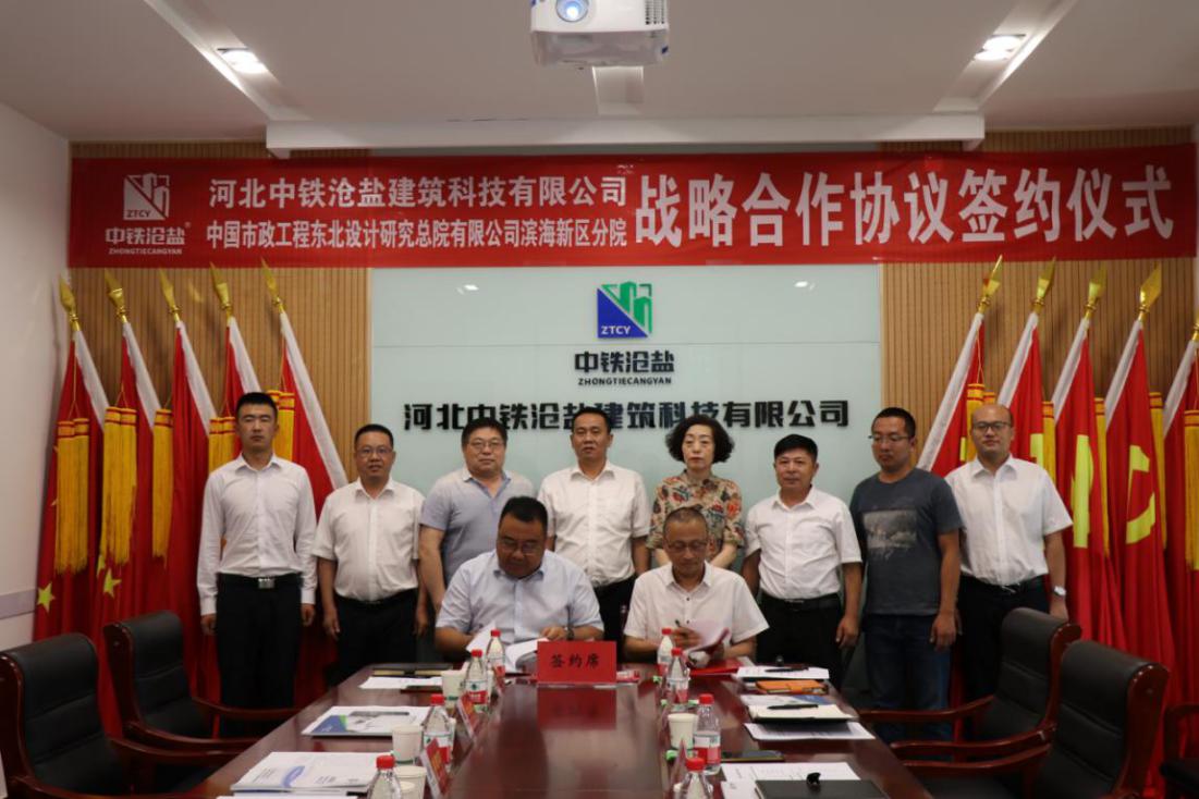 2020年7月9日,河北中鐵滄鹽建筑科技有限公司與中國市政工程東北設計研究總院有限公司濱海新區分院戰略合作簽約儀式成功舉行。此次活動特別邀請了滄州鹽業集團黨委書記、董事長劉建軍、工會主席李金營出席會議,中鐵滄鹽副董事長王峰偉,總經理王志巖,東北設計研究院濱海分院院長紀云公,副院長孫洪艷等相關領導共同出席此次戰略合作簽約儀式。