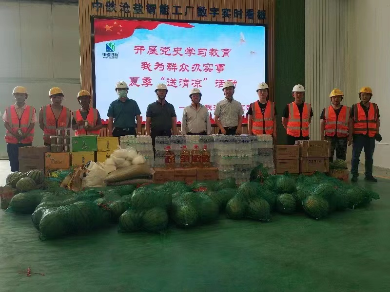 公司黨支部書記、總經理王志巖,行政副總經理王新全、總會計師李紅標、生產副總經理凌磊參加本次活動,王志巖代表公司領導班子向奮戰在高溫一線的干部職工送上公司的親切問候,感謝他們為中鐵滄鹽發展所作出的貢獻,并要求廣大黨員干部職工要時刻把安全生產意識放在心中,牢記高溫季節施工安全注意事項,嚴格落實安全生產的主體責任,確保各項防暑降溫措施都做到位,科學安排工作時間,切實保障生產人員的安全健康。同時為生產一線的職工們送上了綠豆、白糖、飲料、解暑藥等清涼物資及豬肉、食用油等生活物資的同時公司還為廠房加裝了電風扇改善生產工作環境,通過此次“送清涼”活動,讓廣大職工感受到了“家”的溫暖,也是開展黨史學習教育活動中“我為群眾辦實事”的充分體現,切實把黨的貼心關懷送到奮戰在一線的工作人員手中、送到職工群眾的心坎上,讓職工感受到黨的溫暖,感黨恩,跟黨走。