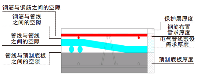1.強電干線與普通管線交叉住宅中的電氣管線大部分為PC20(普通管線,直徑20mm),但從電井至強電箱的強電干線一般采用PC32(干線主管,直徑32mm)。在電氣干線經過且與普通管線交叉的疊合板區域,對電氣管線敷設空間需求比普通管線PC20之間交叉區域大15mm左右(包含部分空隙)。
